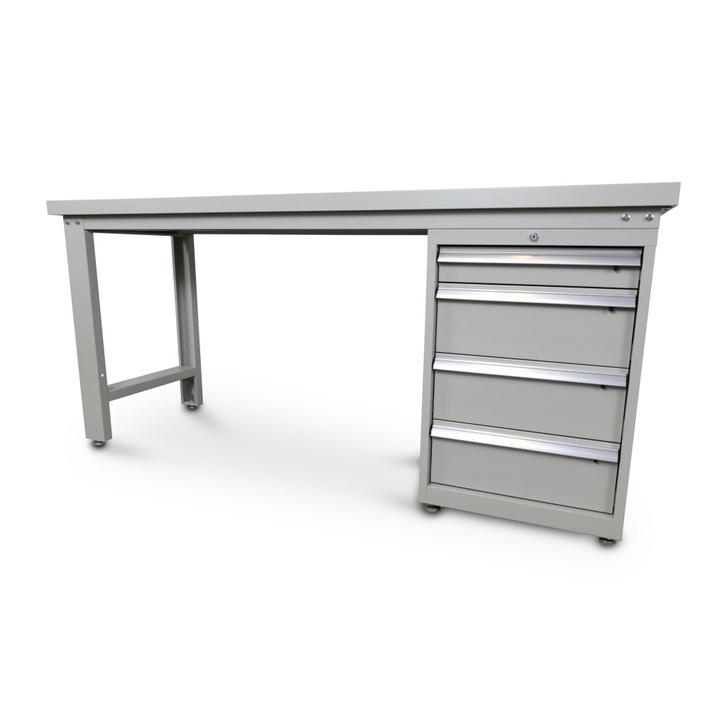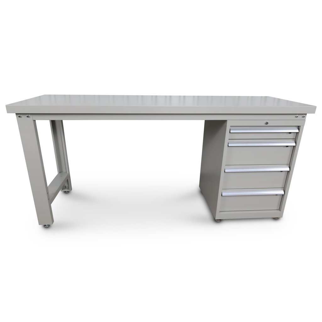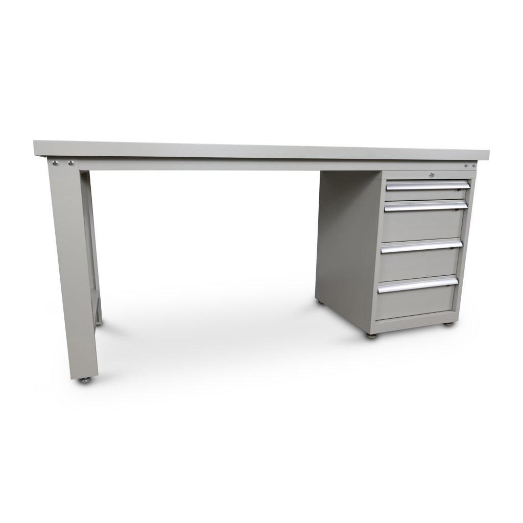 Stativet är av stål som är pulverlackerat i ljusgrå färg med mellanstag i botten vilket ger bättre stabilitet. I botten av benen sitter det 4st justerbara fötter för ojämnt golv. Arbetsbänken kan kombineras med verktygshurts och verktygstavla.
