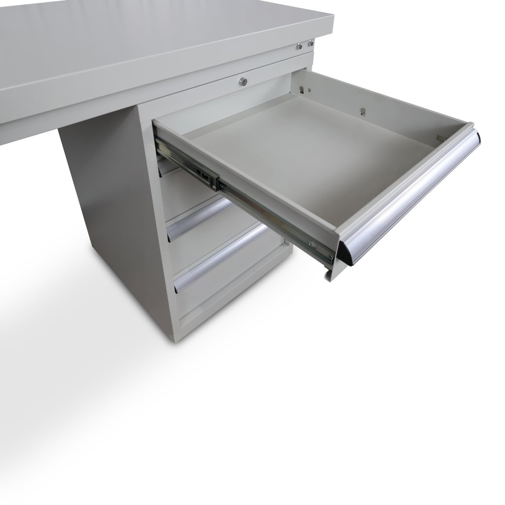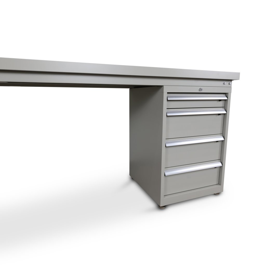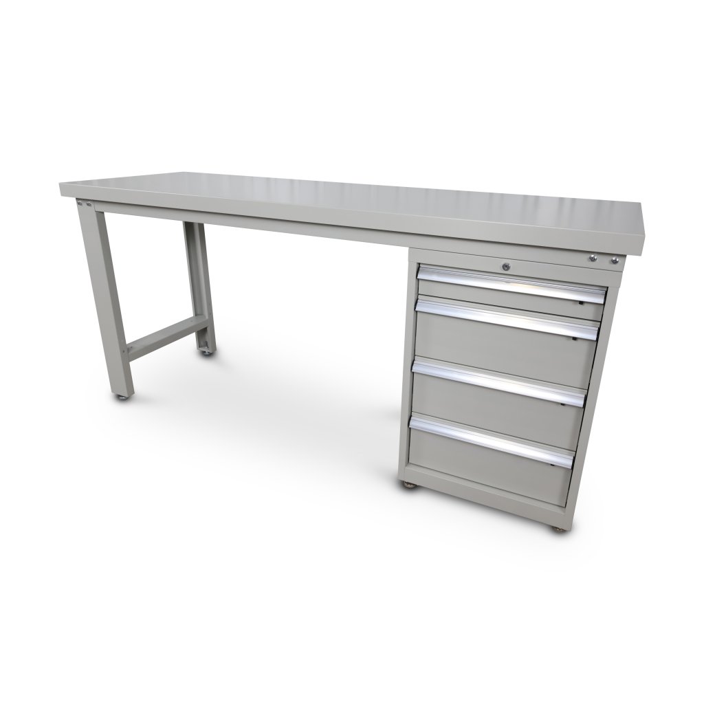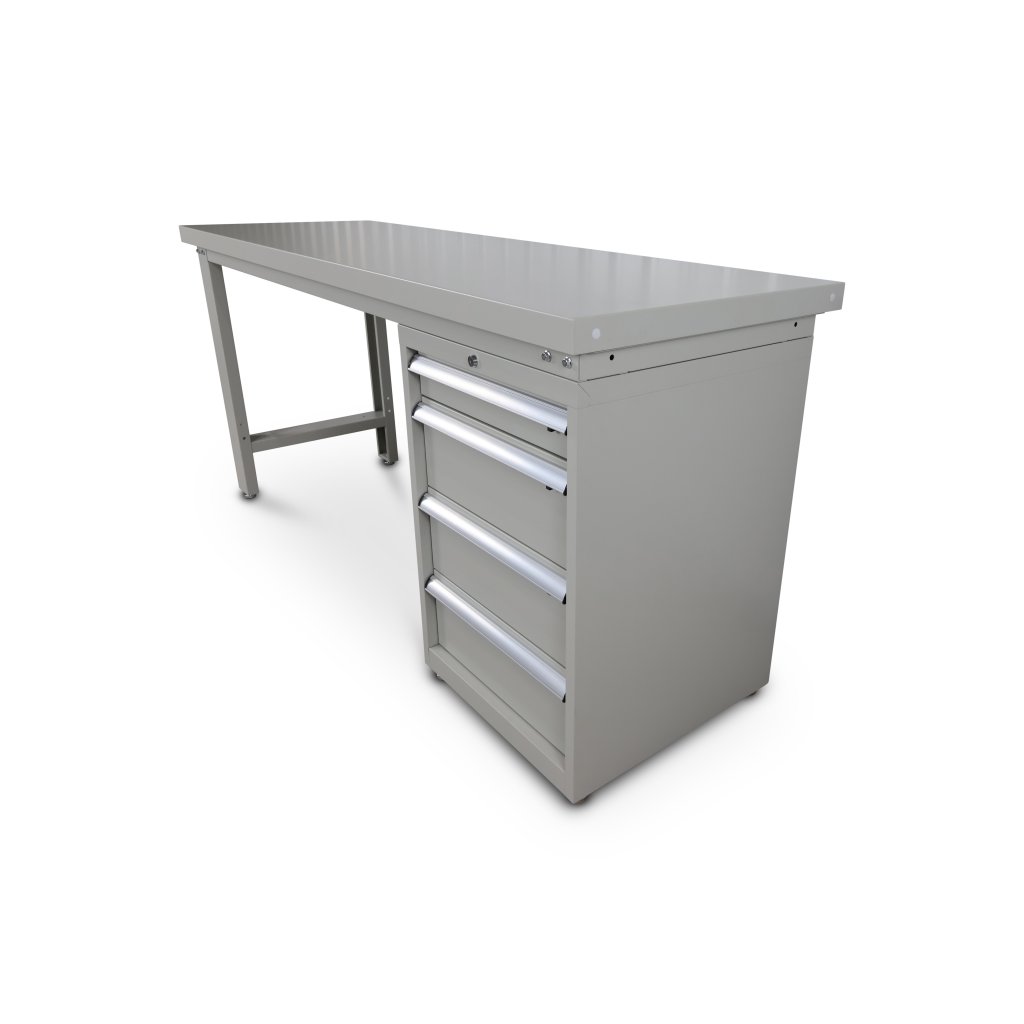 Stativet är av stål som är pulverlackerat i ljusgrå färg med mellanstag i botten vilket ger bättre stabilitet. I botten av benen sitter det 4st justerbara fötter för ojämnt golv. Arbetsbänken kan kombineras med verktygshurts och verktygstavla.